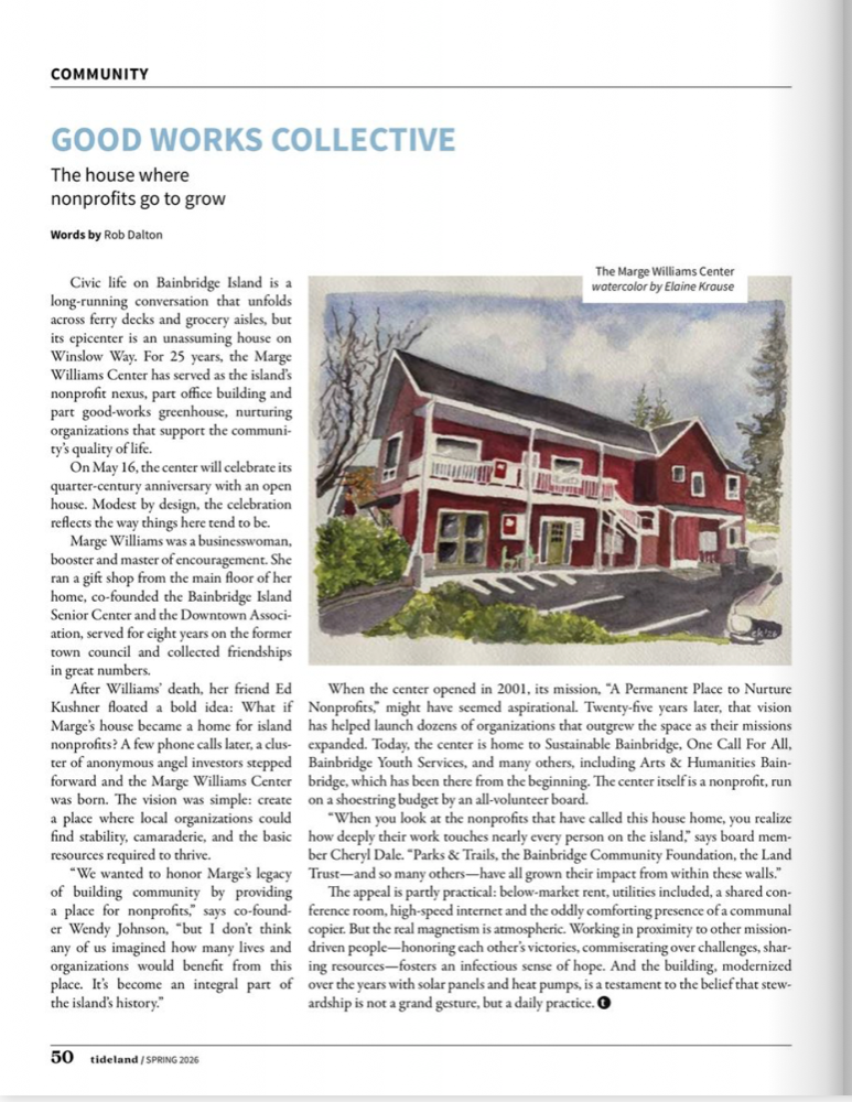 The Marge Williams Center will celebrate 25 years in 2026. Founded in 2001 to honor the life of civic leader Marge Williams, the center has been home to many beloved Bainbridge Island nonprofits through